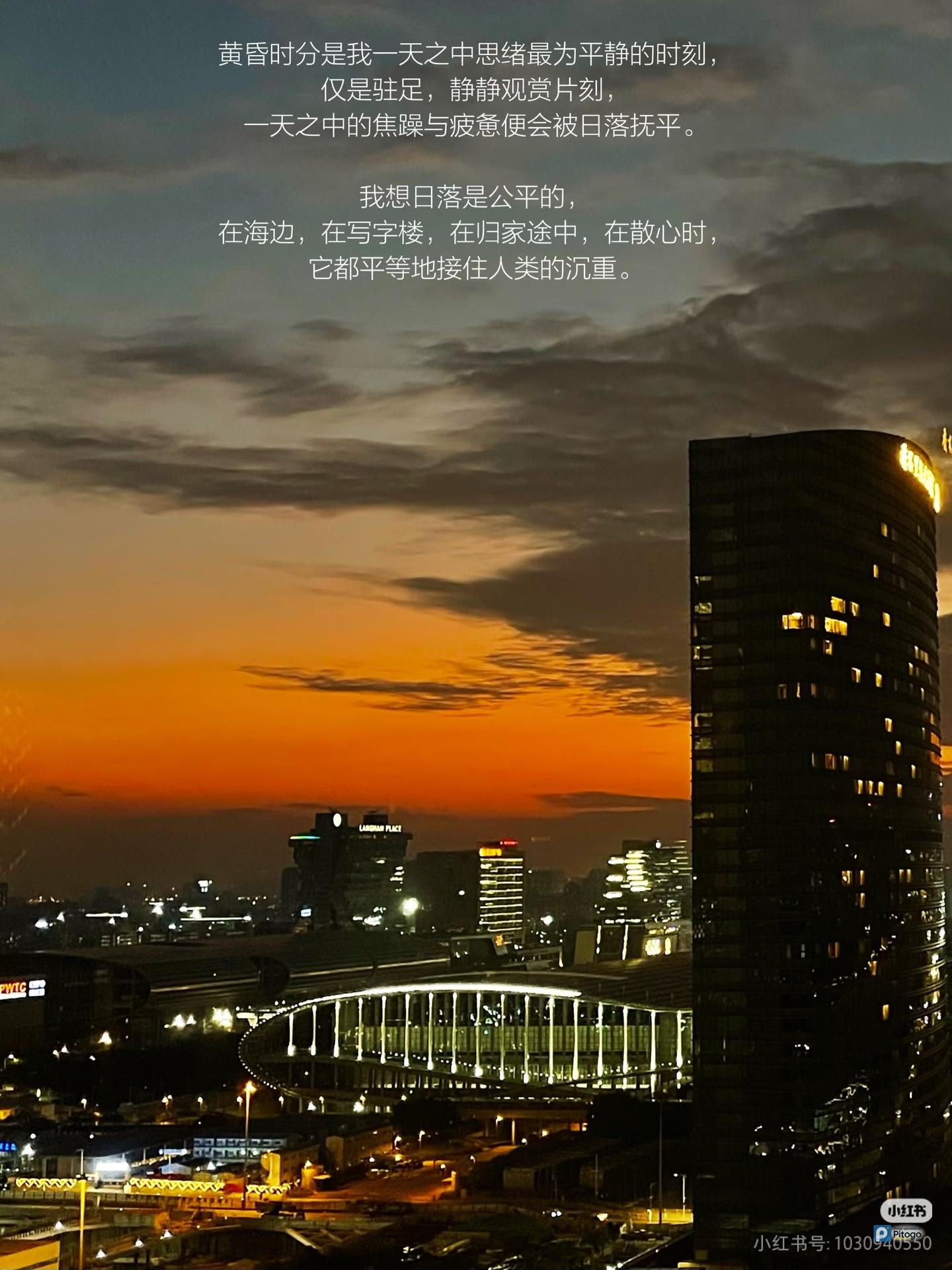 黄昏时分是我一天之中思绪最为平静的时刻,仅是驻足,静静观赏片刻,一天的焦躁与疲惫便会被日落抚平。日落是公平的,在海边,在写字楼,在归家途中,在散心时,它都平等地接住人类的沉重。