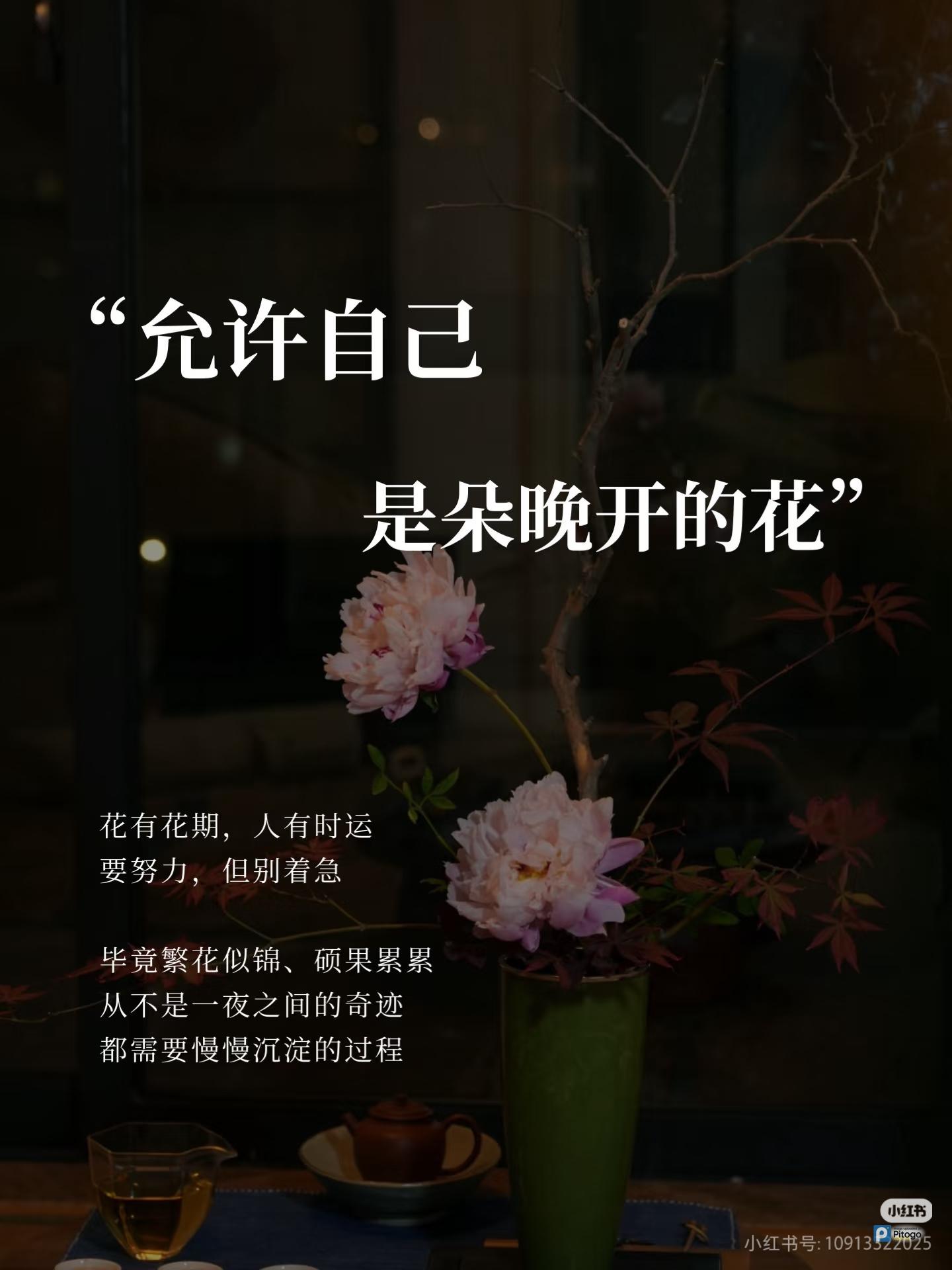 成长感悟|允许自己是朵晚开的花 花有花期,人有时运 要努力,但别着急 · 毕竟繁花似锦、硕果累累 从不是一夜之间的奇迹 都需要慢慢沉淀的过程 · 有些花开在万物复苏的春天 有些开在蝉鸣阵阵的盛夏 还有些开在霜叶满地的秋日 · 每个人的花期不同 不必盯着别人的绽放焦虑 更不用急着追赶那些不属于自己的“提前拥有” · ❶ 不必过度追赶别人的脚步 每个人的起点不一样 要走的路也千差万别 别总把“和别人比”当成标准 · 多和昨天的自己比 今天比昨天多学一个小技巧 今天比昨天少一点内耗 就是实实在在的成长 · 摩西奶奶76岁才开始画画 褚时健75岁才开始种橙子 人生的每个阶段都不算晚 · ❷ 每一个阶段,都是在为未来蓄力 别着急,允许自己慢慢来 就像春耕、夏种、秋收、冬藏 所有的收获,都要经得住时间的打磨 · 把自己当种子一样培育 按时施肥、浇水、除草 剩下的交给时间就好 · 养自己真的就跟养孩子一样 多给自己一点爱、耐心和用心 慢慢就会收获一个更有生命力的自己 · ❸ 相信自己,终会和美好相逢 以前我特别羡慕那些优秀咨询/疗愈师 刚开始接个案时,也会被对方的情绪干扰到 熬过崩溃、焦虑的夜晚 陷入过自我怀疑的内耗 · 但我没停下脚步 静下来思考怎么用冥想疗愈助力 琢磨怎么带更多女性慢慢成长 一步一步“行动-改进-再行动-再调整” · 如今,我接个案也能应对自如 成了曾经羡慕的样子 · 其实人生的花期或早或晚 都有自己的精彩 就算你想做一朵不开的花 也没什么不可以 · ❹ 做长期主义者,让热爱成为底气 选一件自己喜欢的事坚持下去 我喜欢冥想、读书、写文案 做自己热爱的事 沉浸其中时,内心会生出源源不断的力量 · 每一段冥想音频 都是我用声音链接你的桥梁 更是我透过自己的经历后 想送给女性朋友的温暖礼物 · 那些看似平淡、没有波澜的日复一日 终会在某一天,让你清晰看到坚持的意义 · 每个人都有自己的花期,别慌 允许自己是那朵晚开的花 · 如今37岁的我终于明白 不用急着活成别人期待的样子 慢慢来,好好爱自己,成为自己就好