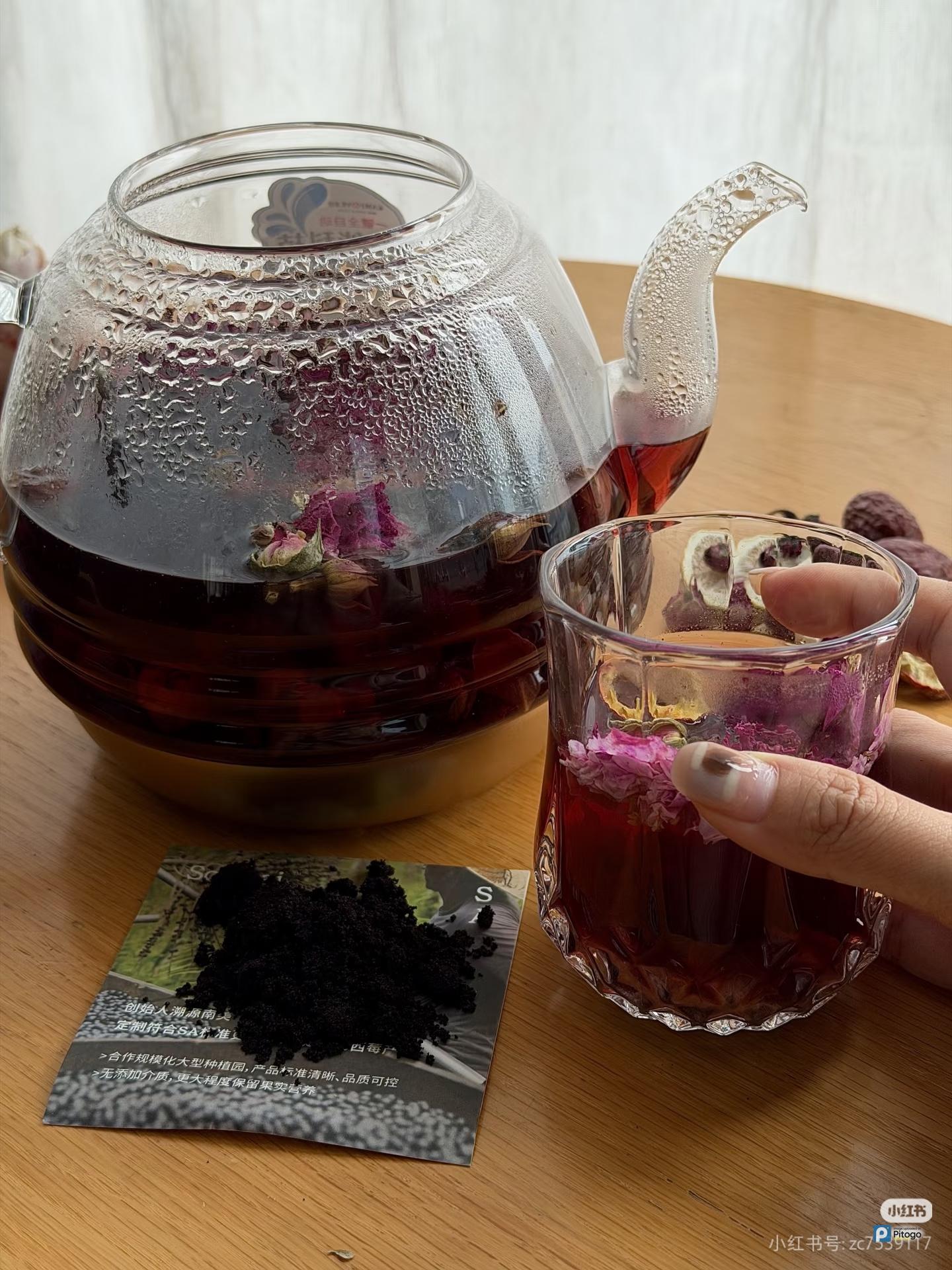 花茶部分搭配就是靠这几样:玫瑰、茯苓、红枣、柠檬片、山楂、黄芪、巴西莓粉