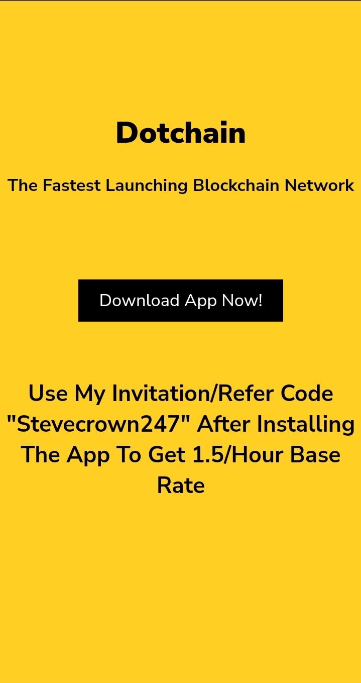 Be part of the FASTEST LAUNCHING blockchain network. 💯 free mining legit project Dotchain mainnet is launching 50X to 90X faster than any other blockchain project, which allows users to earncoins using a handy device. Use this link to join and start mining DOT & Play games to Win ACE Step 1️⃣. Search for DOTCHAIN on your playstore Step2️⃣ download the dotchain app Step3️⃣ Register with your active email address and start mining ✅Use my invitation code( Stevecrown247 )