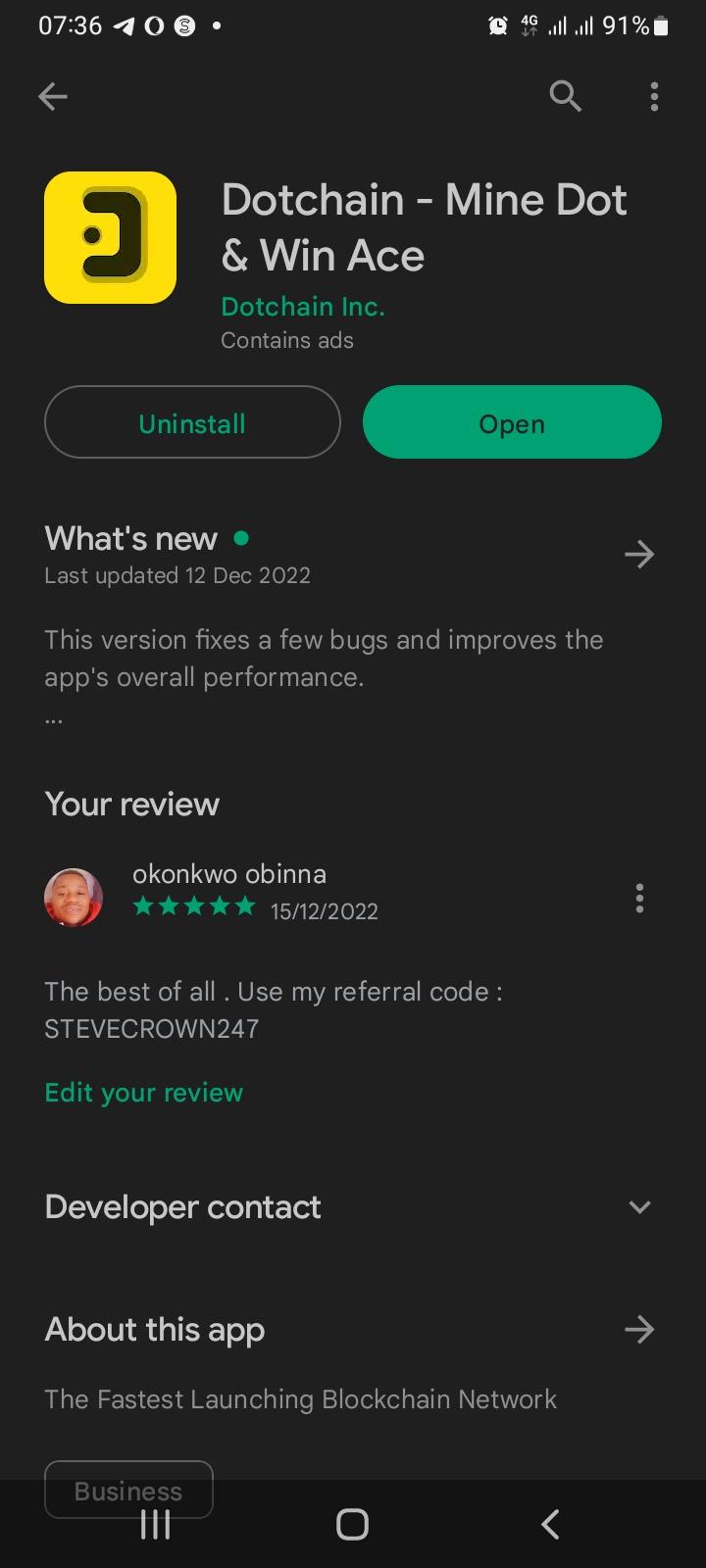 Be part of the FASTEST LAUNCHING blockchain network. 💯 legit project Dotchain mainnet is launching 50X to 90X faster than any other blockchain project, which allows users to earncoins using a handy device. Use this link to join and start mining DOT & Play games to Win ACE Step 1️⃣. Search for DOTCHAIN on your playstore Step2️⃣ download the dotchain app Step3️⃣ Register with your active email address and start mining ✅Use my invitation code( Stevecrown247 ) to get 1.5/hour base rate. --100% Transparent Live Stats--
