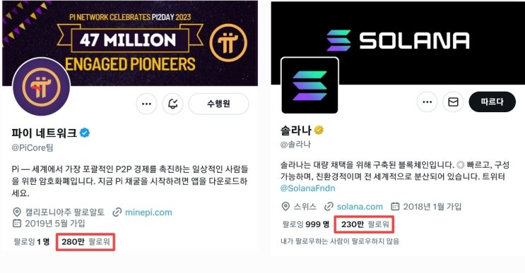 >>Solana VS Pi<< -정리자: GGyu- 솔라나(Solana)와 파이네트워크(PI Network)는 모두 암호화폐 분야에서 중요한 역할을 하는 프로젝트입니다 각각의 특징과 장단점이 있으므로 비교해 보겠습니다 《23년 11월 27일》 ⛔️솔라나의 유통량 & 개당 시세(4억2천3백만개/약 7만4천원) ⛔️Pi의 유통량 & IOU 개당 시세(8억2천4백만개/약 4만6천원) ■솔라나의 장점 1. 높은 처리량 솔라나는 초당 최대 65,000개의 트랜잭션을 처리할 수 있는 높은 처리량을 가지고 있습니다 (실제는 3천여건이 정상적으로 처리, 추후 8가지 혁신적인 기술을 활용하여 최대 목표TPS는 710,000건) 이는 분산된 네트워크와 병렬 처리 기술을 활용하여 가능합니다 2. 낮은 거래 비용 솔라나는 저렴한 거래 비용을 제공합니다 이는 높은 처리량과 효율적인 네트워크 구조 덕분에 가능한 것입니다 3. 빠른 속도 솔라나는 빠른 블록 생성 시간과 빠른 거래 처리 시간을 가지고 있습니다 이는 사용자들에게 신속한 거래 체결 경험을 제공합니다 ■솔라나의 단점 1. 초기 생태계 솔라나는 상대적으로 생태계가 다른 일부 암호화폐에 비해 상대적으로 적을 수 있습니다 이는 프로젝트의 성장과 함께 개선될 수 있습니다 2. 분산화의 위험성 솔라나는 일부 유저에게는 과도한 중앙집중화에 대한 우려를 줄 수 있습니다 이에 대한 균형 유지와 분산화 측면에서 노력이 필요할 수 있습니다 ■파이네트워크의 장점 1. 쉬운 참여 파이네트워크는 모바일 애플리케이션을 통해 사용자들에게 암호화폐에 참여할 기회를 제공하고 사용자는 누구나 쉽게 가입이 가능하고 공정한 보상을 받을 수 있습니다 2. SCP 방식 파이 네트워크는 기존의 채굴과 달리 채굴 과정을 간소화하고 에너지 효율적인 SCP방식(스텔라의 유전자를 물려 받음)을 채택하고 있습니다 이로 인해 채굴에 참여하기 위한 하드웨어 요구사항이 낮아지고 개인들도 비교적 쉽게 채굴에 참여할 수 있는 환경이 조성됩니다 3. 생태계 발전에 대한 보상(웹3.0 방식) 파이 네트워크는 사용자가 네트워크에 기여하고 생태계의 성장을 도모하는 것을 보상하는 경제 모델을 가지고 있습니다 이는 참여자들이 더 많은 동기를 갖고 네트워크에 기여할 수 있게 하며 생태계의 발전을 촉진합니다 4. 보안과 신뢰성 파이 네트워크는 암호화 기술과 분산화된 합의 메커니즘을 통해 높은 보안 수준을 유지합니다 이는 사용자들의 자산 및 개인 정보를 안전하게 보호하고 신뢰성 있는 거래 환경을 제공합니다 (ex: Pi의 자체적인 KYC, 비수탁지갑 등) 4. 생태계의 확장성 파이네트워크는 현재 다양한 생태계를 통해 사용자들에게 다양한 서비스와 혜택을 제공하고 이는 사용자 경험과 생태계 확장을 촉진합니다 (ex: 온/오프라인 결제, DApps, 포럼 등) 5. 다양한 애플리케이션 지원 파이 네트워크는 블록체인을 기반으로 다양한 애플리케이션을 지원합니다 이는 개발자들이 파이 네트워크를 활용하여 자유롭게 DApp을 개발하고 배포할 수 있는 환경을 제공하며 사용자들은 다양한 서비스와 생태계에서 혜택을 누릴 수 있습니다 6. 높은 처리량 전통적으로 국가 간 송금에는 상당한 시간과 비용이 소요되지만 초당 70,000건의 트랜잭션을 관리할 수 있는 능력(글로벌 전송 속도: 3~5초)을 갖춘 Pi Network는 모든 트랜잭션을 신속하게 완료할 수 있도록 보장합니다 7. 분산화된 노드 파이네트워크는 현재 테스트넷 단계로 활성노드가 17만 이상(ㅎㄷㄷ)이며 탈중앙화된 블록체인 네트워크로 중앙 기관이 없고 개개인의 참여로 운영됩니다 이는 사용자들에게 보다 높은 자유와 권한을 제공하며 중앙 집중화의 위험성을 감소시킵니다 《이러한 장점들은 파이 네트워크가 탈중앙화, 보안, 채굴의 간소화 등을 통해 혁신적인 블록체인 생태계를 구축하고 있다는 것을 보여줍니다》 ■파이네트워크의 단점 1. 상대적으로 낮은 가치 파이네트워크는 현재 가치가 상대적으로 낮다는 점이 있지만 이는 전혀 새로운 초기 단계의 프로젝트로서 가치가 점차 올라갈 수 있는 가능성이 높습니다 2. 거래 제약 사항 파이네트워크는 일부 규칙과 제한이 존재(현재 폐쇄형 메인넷 기간)하여 거래에 제약을 받을 수 있습니다 이는 시스템의 안정성을 위한 조치일 수 있습니다