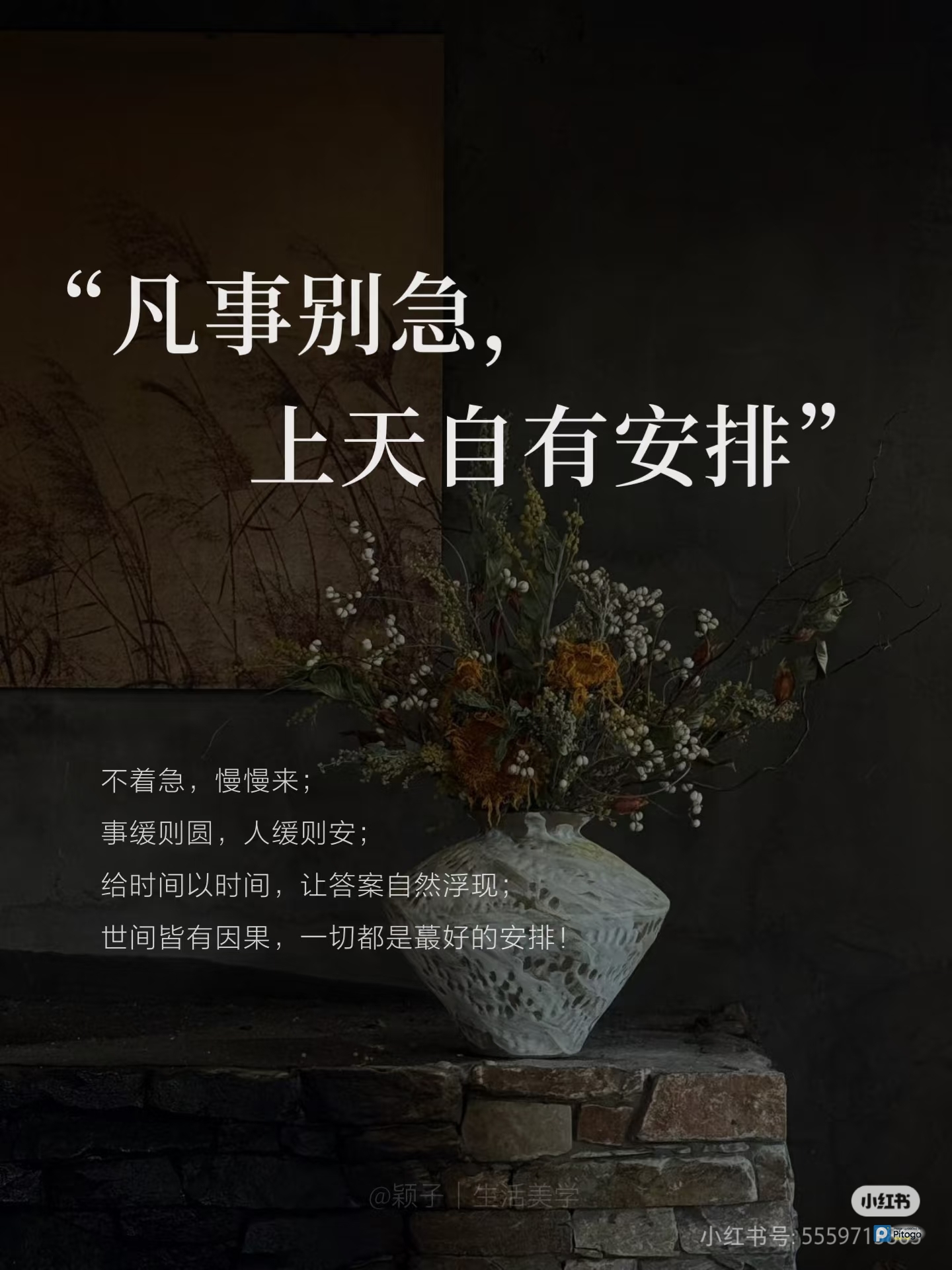 凡事别急,上天自有安排”允许自己慢慢来 人生就是这样,不是得到,就是学到; 所有来到你身边的人和事都是来成全你的, 每一次相遇,每一份遗憾都各有意义。 - 这烟火人间,事事值得,也事事遗憾, 如果事与愿违,请相信一定另有安排; 一帆风顺的旅途养不出坚韧的灵魂, 那些让你挣扎的裂痕,终将成为光照进来的地方; - 我们总是容易以当下的得失衡量结局, 却忘了成长不是一蹴而就的瞬间绚烂; - 你要在等待中耐心地沉淀, 认准方向后,极致的重复, 把当下的每一件小事儿都做好; - 我从2025年初加入摆渡人美学研习, 坚持每天阅读,写读写笔记,练习摄影和文案, 坚持小红书的更新,并收获了很多同频的姐妹; - 你要相信, 命运的手笔原比我们想象中的要宏伟; - 它绝对不会亏待任何一个努力有耐心的人; 那些你暂时还没实现的愿望,都在奔向你的路上, 也许稍微有点塞车,别着急,总会到的; - 生活是一场马拉松, 你得做好打个持久战的心理准备; 去往成功的路上需要你足够的耐力和毅力, 才能跑到蕞后,笑得更甜; - 生活中, 时常会遇到一些让人着急跳脚的糟心事; - 我在这种情况下,会先做个深呼吸, 然后给自己说“一切都是蕞好的安排” 这个动作会让自己快速地静下来, 不被情绪裹挟,用理性的头脑解决眼前的问题; - 一路走来, 我们收获着也在失去着; - 失去,有时候也是另一种获得的开始, 你以为的“遗憾”“错过” 也许是命运在为你筛选掉不合适的人和事; - 不着急,慢慢来; 事缓则圆,人缓则安; 给时间以时间,让答案自然浮现; 世间皆有因果,一切都是蕞好的安排! 嗨,我是颖子, 很高兴认识你! 🍀 把生活过成诗,把朋友圈写成书